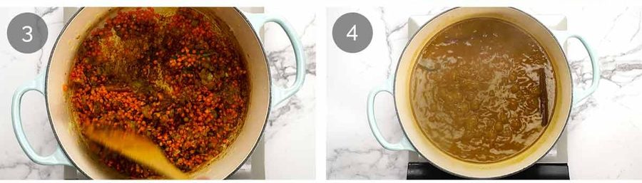 Spices and lentils – Next, add the spices and toast them for 30 seconds, then in go the lentils. Stir to coat them in all the tasty spice flavour. Right about now, you know you’re onto something really tasty!