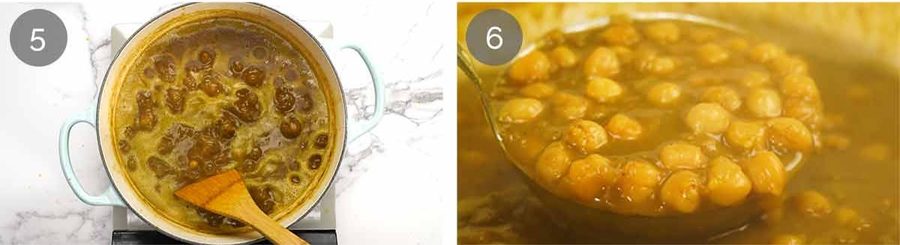 - Simmer chickpeas – Add the chickpeas, water and baking soda. Increase the heat to make it simmer again. Then lower the stove slightly and leave to simmer gently for 30 minutes without a lid or until the lentils mostly broken down to make a thin gravy (you can cook an extra 10 minutes to thicken more if you want).