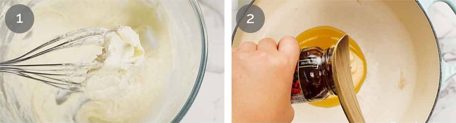 Make whipped ricotta – Just mix the ricotta, parmesan and milk together using a hand whisk. At first, it will seem lumpy and thoroughly unimpressive, but after about 10 seconds of vigorous whisking it will loosen and transform into a soft creamy mixture almost like softly whipped cream. Adjustment note: Different brands of ricotta have different consistencies, so add a touch of extra milk if needed.