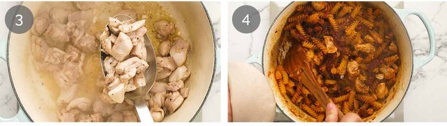 - Cooking liquid – Add pasta and cooked chicken along with any juices accumulated in the bowl. Stir to coat in all the tasty flavours. Add the stock, canned tomato, salt and pepper.