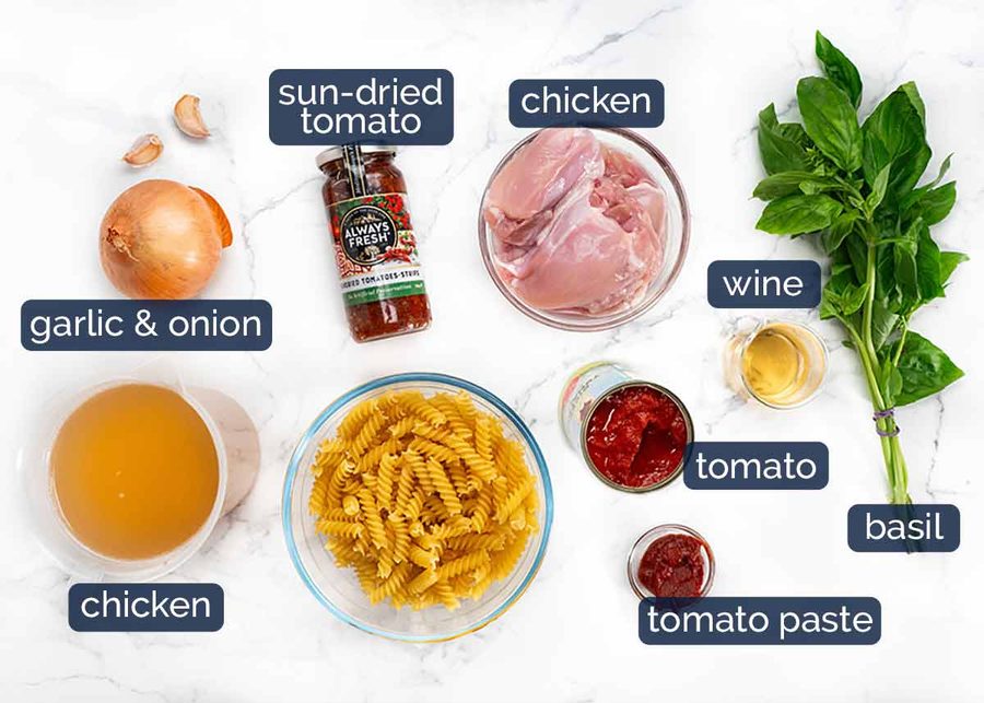 Here’s what you need for the pasta. The sun dried tomato adds fabulous flavour pops, plus we use the oil from the jar to cook the chicken. Free flavour – and free oil!