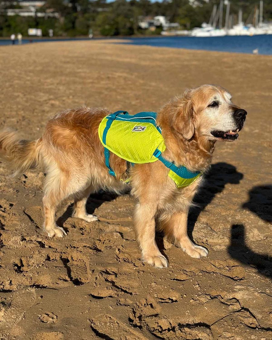 And today, we have Dozer Maehashi modelling a vibrant green High Performance Life Jacket. This is designed for experienced swimmers to provide a wide range of motion and comes equipped with double handles to restrain your dog from lunging at an ice cream cone held by a 5 year old child.