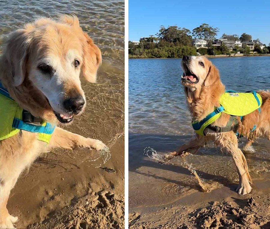 On a serious note: I originally got the High Performance Life Jacket several months ago when Dozer was still mid-rehabilitation, but ended up returning it because I didn’t think it provided enough buoyancy for him. But he’s come such a long away, even being praised by the Magic Dog Doctor for his progress (it’s like getting a gold star at school!), that I decided to give the High Performance Jacket a go again.
