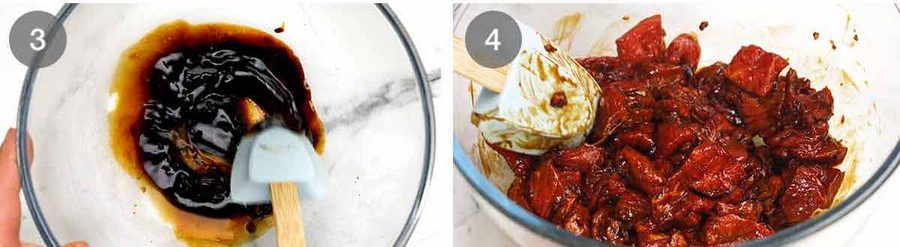 - Marinade & tenderise beef – Mix the marinade ingredients in a bowl then add the beef and toss well. Set aside for 1 hour (up to 24 hours), or the time specified in Note 1.
