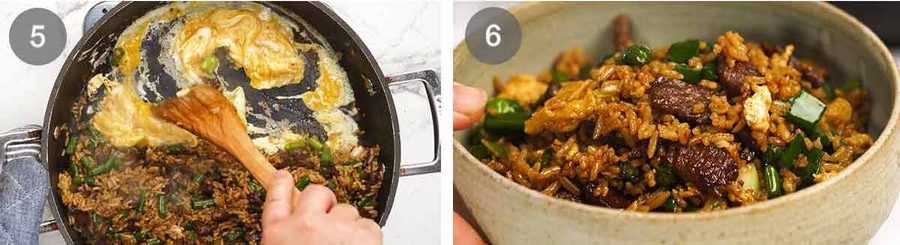 - Marinate beef 1 hour. Cook beef in 2 tbsp oil on high in a large pan until lightly seared, add white part of green onion and beans, cook until beef is caramelised, adding garlic towards the end. Add rice and sauce, toss well. Scramble egg on side of pan, toss through green part of green onion. Eat!