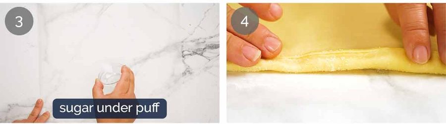 - Fold edge – Place puff pastry on top of the sugar. Fold the edges inwards to create a 1cm / 0.4" edge.