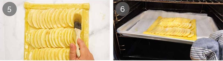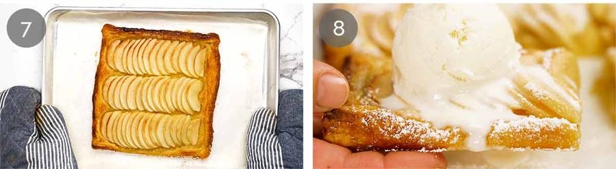 - ABBREVIATED: Sprinkle paper with 3t sugar, put puff on, fold in 1cm / 0.4" edge. Top with apple, brush butter, sprinkle 2t sugar. Bake on preheated tray at 210°C/375°F (190°C fan) for 30 minutes.