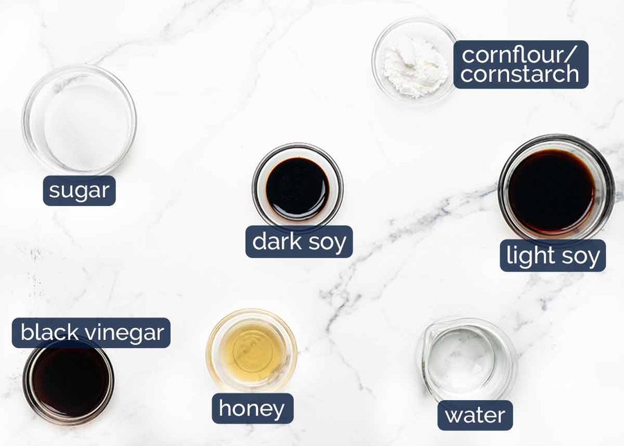Chinese black vinegar – Looks like balsamic vinegar and tastes a bit like it too but with a slight savoury edge. Available at Asian stores and some large supermarkets, though honestly I wouldn’t get it just for the small amount required in this recipe. Substitute with half balsamic vinegar and half rice vinegar instead (it’s pretty close).