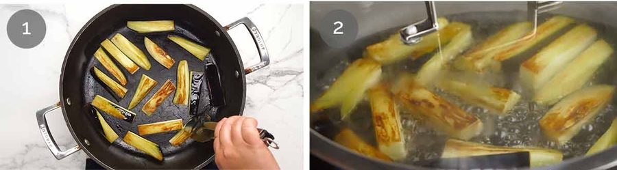 - Brown eggplant – Heat 2 tbsp oil in a large non-stick pan (with lid) over medium high heat. Pan fry eggplant for 1 1/2 minutes on each side until lightly browned.