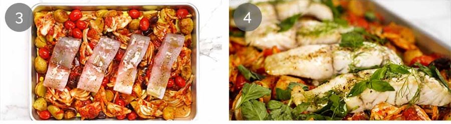 I use barramundi in this recipe. The meaty and juicy flesh makes it ideal for the assertive Mediterranean flavour of the puttanesca-ish sauce, and the fillets are thick enough to make them suitable for cooking in the oven.