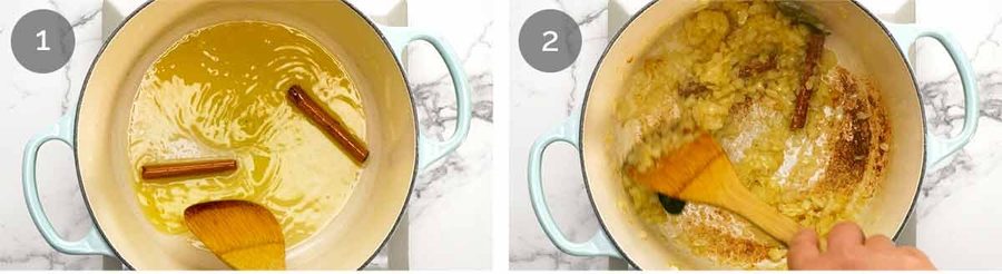 - Sauté – Melt the ghee in a large pot over medium high heat. Add the cinnamon and toast for 30 seconds. Add the onion, ginger, garlic and bay leaves. Cook for 3 minutes until the onion is translucent (stir regularly so the garlic & ginger don't catch).
