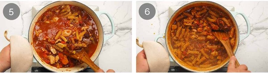- Cooking liquid – Add pasta and cooked chicken along with any juices accumulated in the bowl. Stir to coat in all the tasty flavours. Add the stock, canned tomato, salt and pepper.