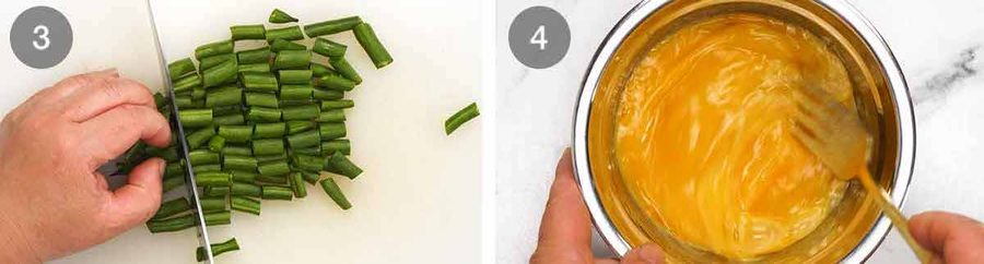 Cutting green beans – Trim the green beans then cut into 1.25cm / 1/2″ pieces.