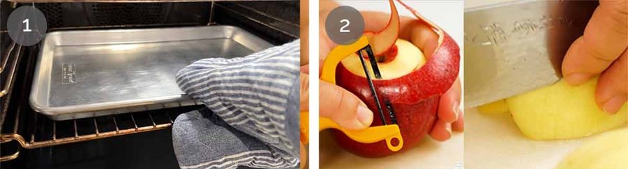 - 2 large gala apples (or 3 medium), peeled, cut in half, core removed, sliced 0.5cm / 0.2″ thick (Note 2)