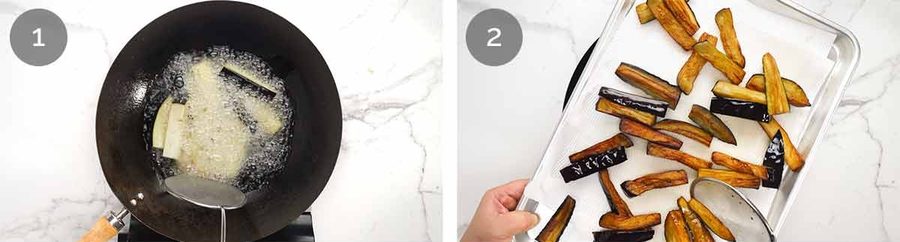 Firstly, choose a method to cook the eggplant. Fried in about 1 cup of oil for the authentic method which will make the eggplant beautifully silky. Or, pan steamed for a healthier version.