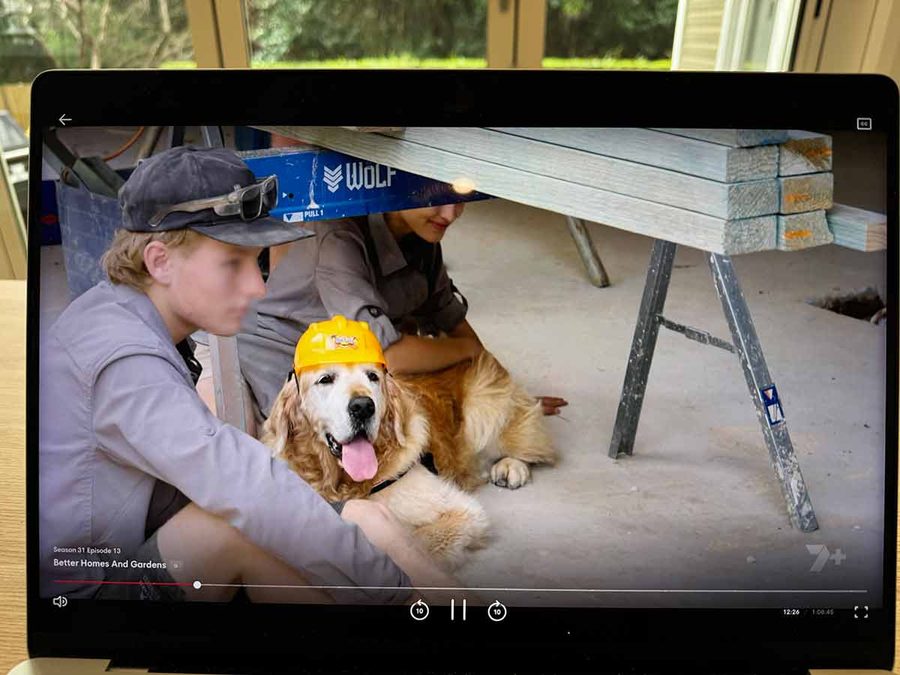 It even got to the point where he was ruining takes – just look at JB’s face in the photo below as Dozer howls mid-filming. So, we had to assign someone the very important (full-time) job of being the official Dozer silencer. That lucky person was Candice, my publicist from Pan Macmillan (my publisher). Poor thing had to endure smelly old-man Dozer breath huffed and barked in her face all afternoon! 😂